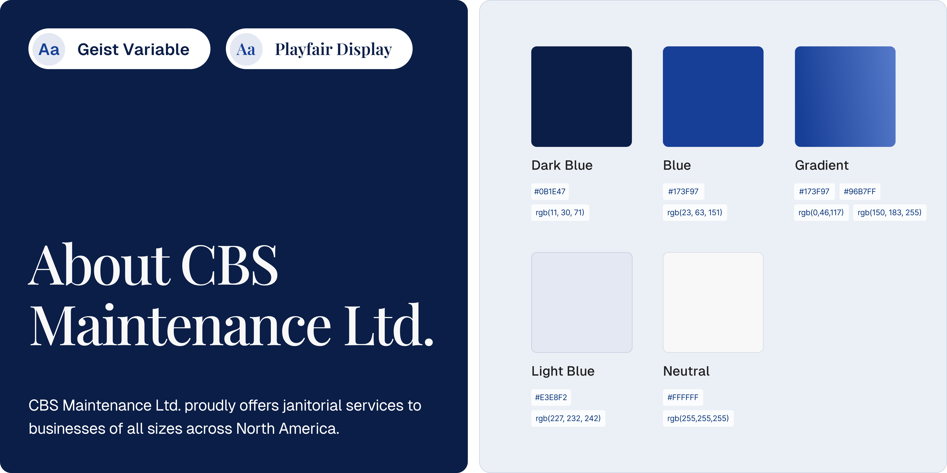 Understanding the importance of color in web design, Brand Vision recommended a refreshing update to CBS Maintenance's color palette. The previous palette was dominated by shades of blue #0B1E47, which were complemented with white. Building upon this foundation, Brand Vision introduced subtle variations and hues to create a more visually dynamic and appealing color scheme.