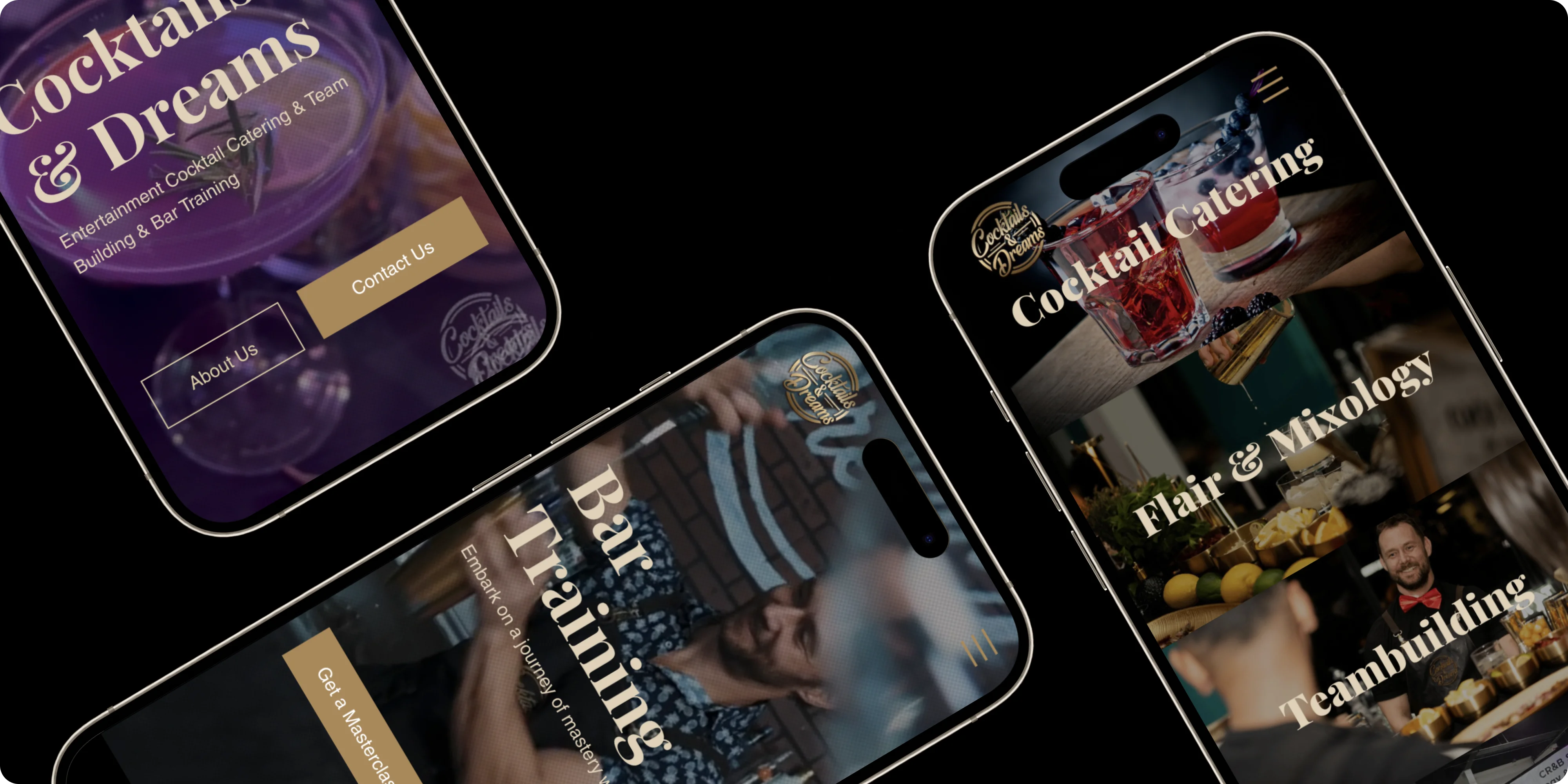 Cocktails & Dreams aimed to redesign their website to enhance the user experience and showcase their unique flair bartending services through compelling visuals and a modern design. The goals included simplifying navigation to ensure visitors can easily find information and services, creating a visually appealing site that reflects the excitement and sophistication of flair bartending, and using high-quality imagery and videos to highlight their services and past events.
