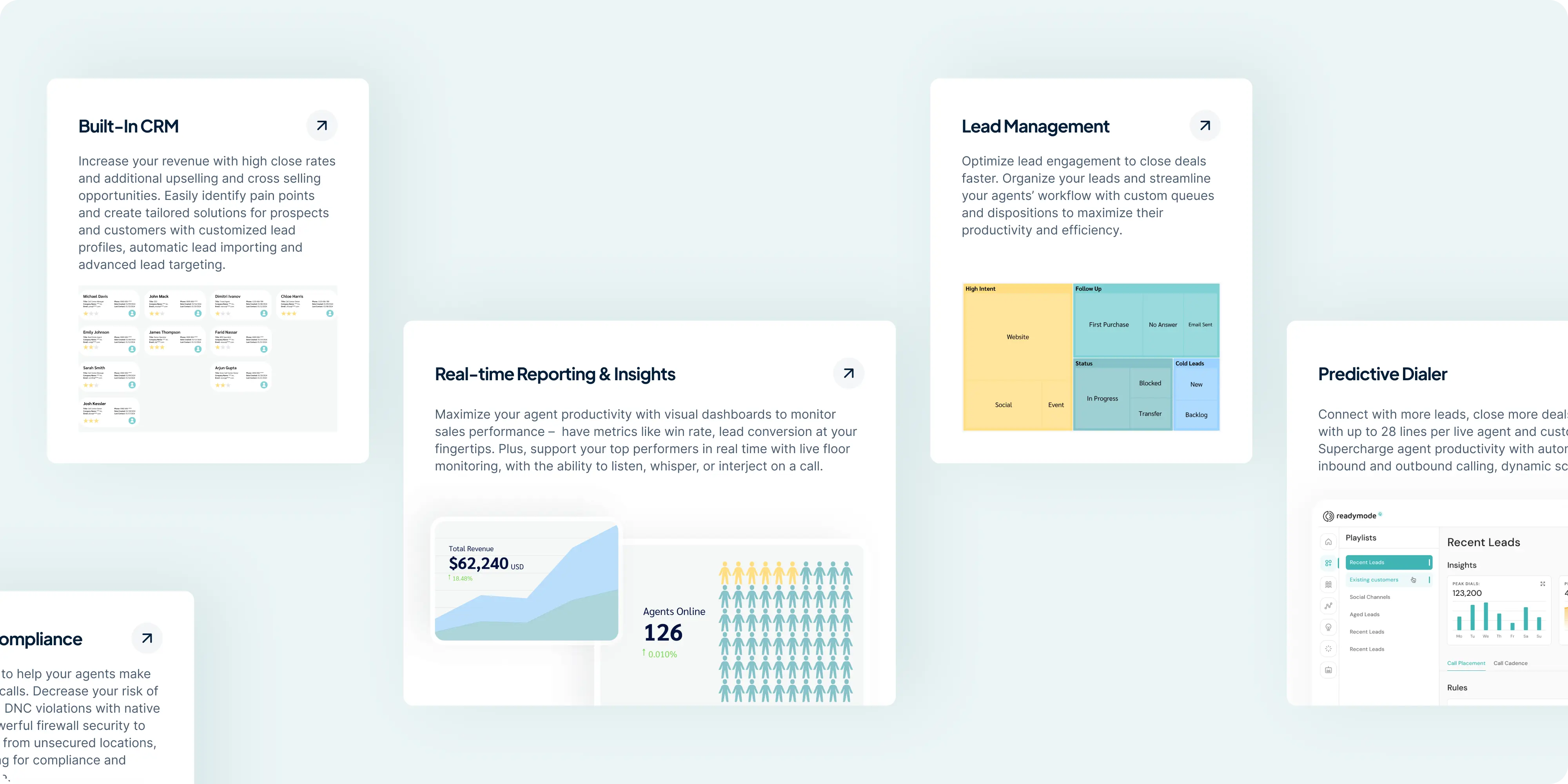 Predictive dialers can feel interchangeable, and buyers juggle acronyms, regulations, and workflow edge cases. ReadyMode needed to differentiate quickly, map features to tangible outcomes (connect rate, agent productivity, compliance confidence), and give multiple audiences, operators, sales leaders, IT/compliance, a clear routes to the next step. At the same time, marketing required a maintainable system to launch new subpages without breaking consistency or speed.