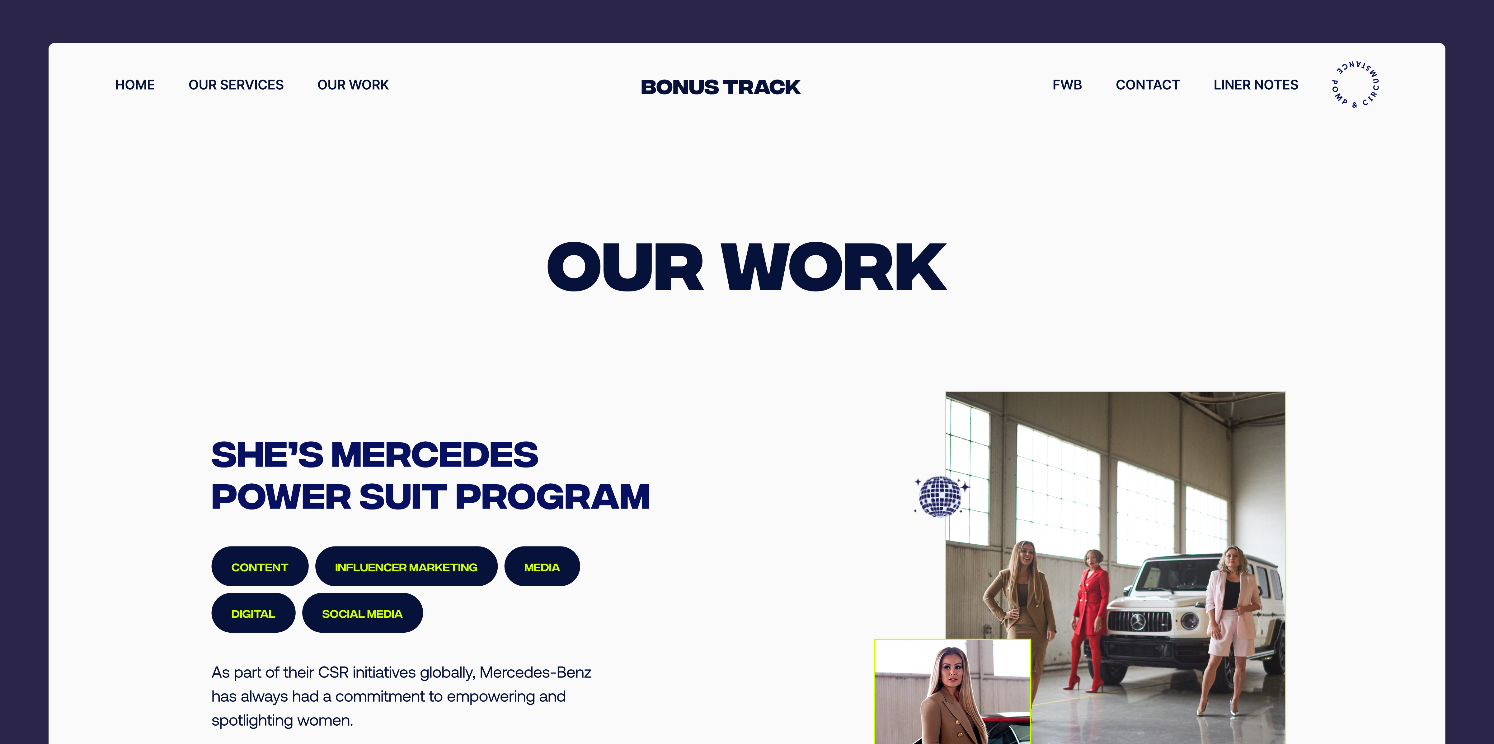 For Bonus Track, we embarked on a web design and development journey, featuring custom animations, interactions, and meticulous attention to UX/UI. The result: an engaging website that harmonizes form and function.