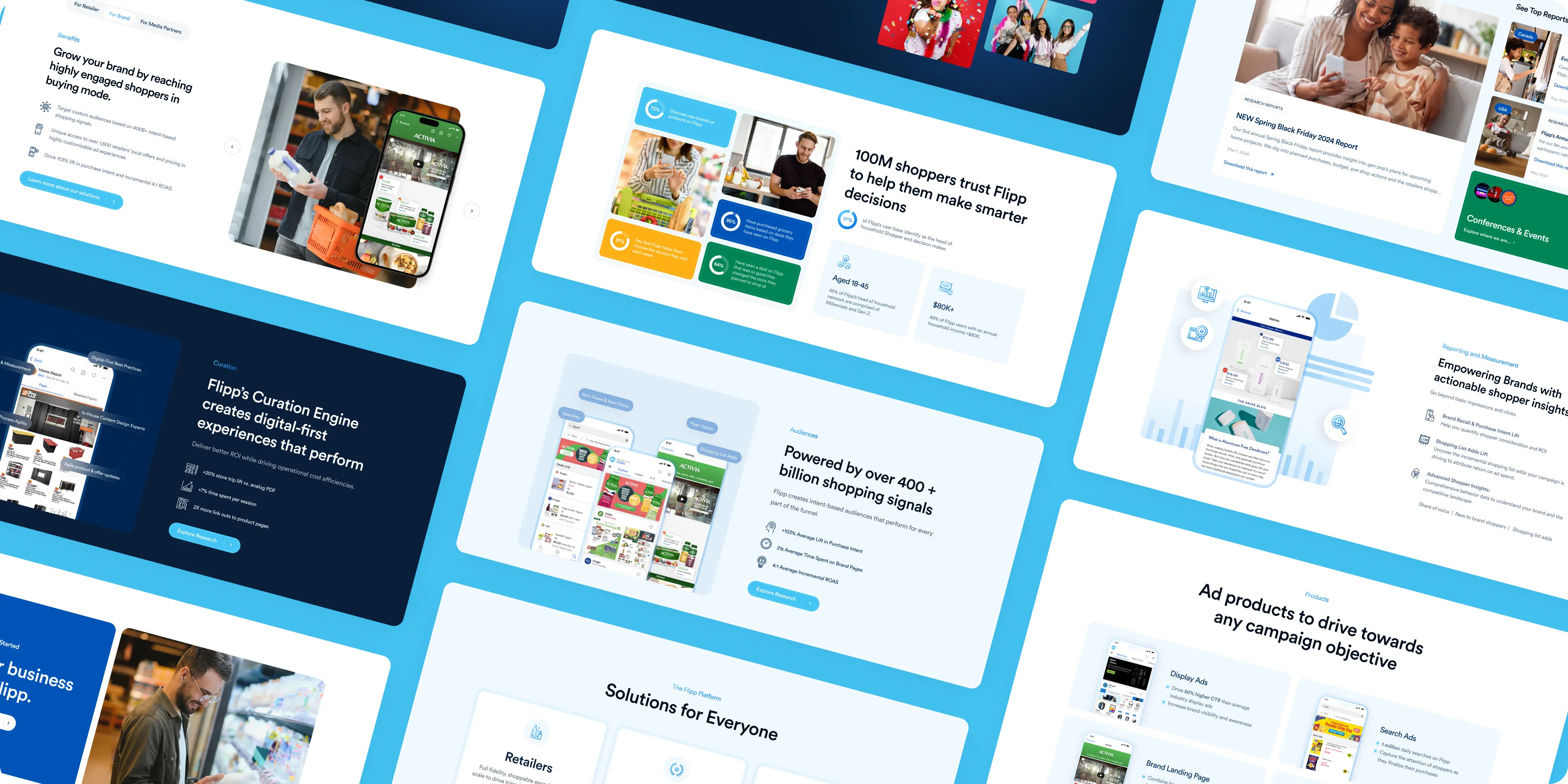 Flipp’s brand equity is consumer‑side; B2B buyers needed a clear, partner‑focused narrative. Existing content mixed audiences and made it difficult to see how ingestion, content, and curation translate to measurable outcomes for retailers, brands, and media. We also had to enable gated, downloadable and traceable reports for demand capture, integrate Greenhouse/LinkedIn, and meet strict performance, accessibility, and consent requirements.