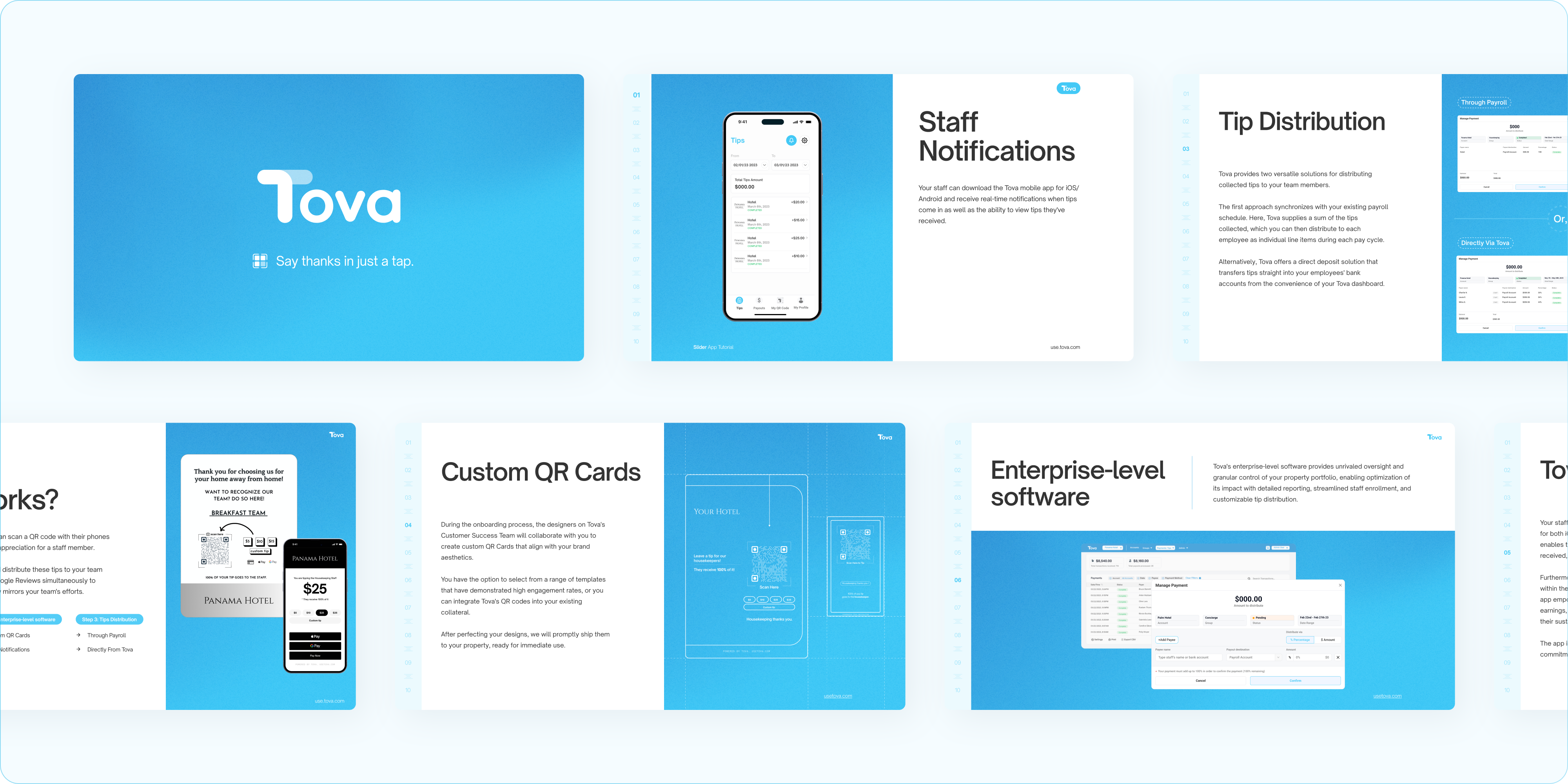 Tova enables guests to tip hotel and restaurant staff via QR codes and cashless payments. Properties can customize branded cards and signage, while managers get real‑time reporting and simpler admin. Our mandate: tell the story in plain language, reduce friction to tip or sign up, and deliver a maintainable web foundation.