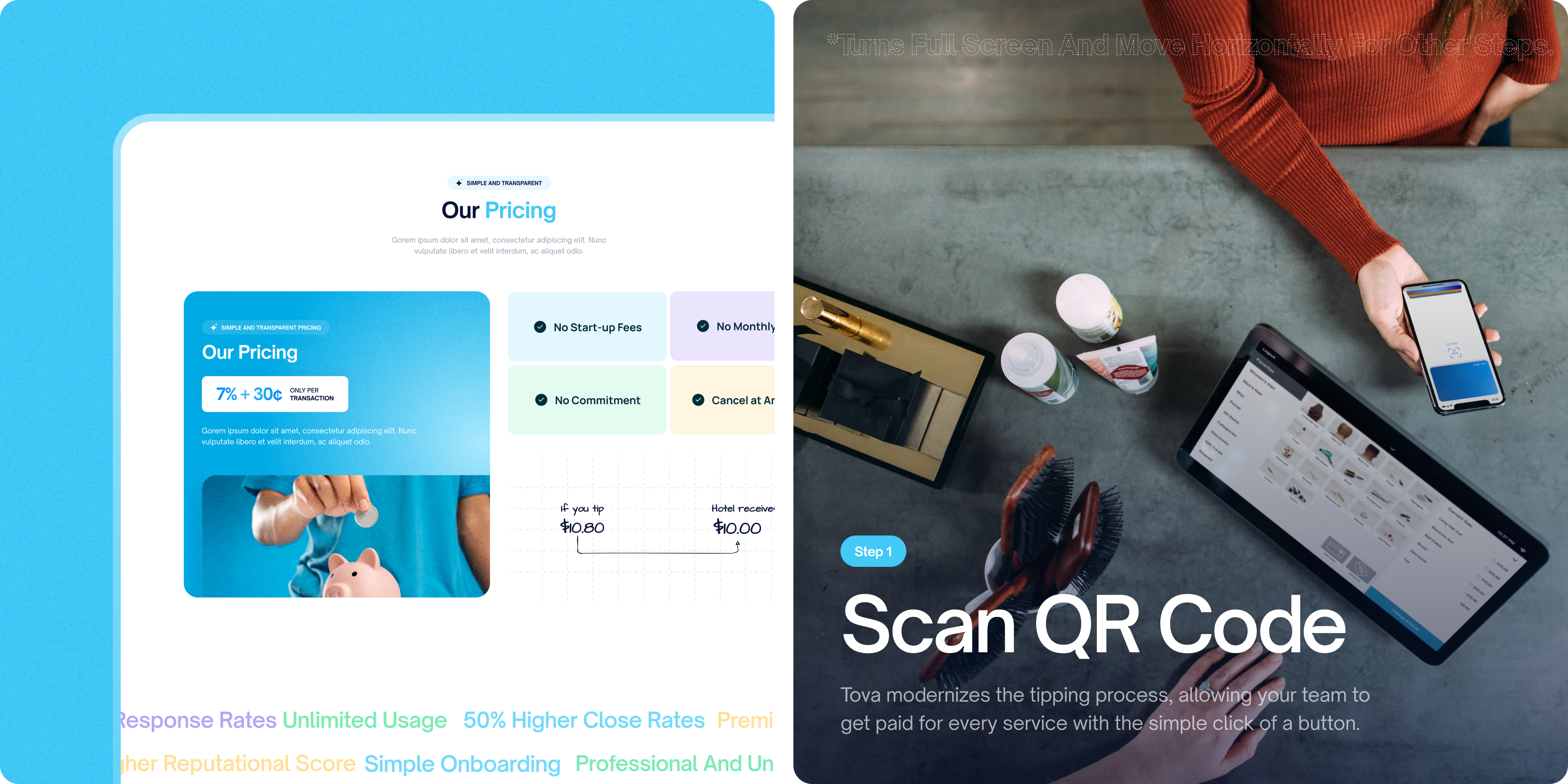 Hospitality audiences are diverse (owners, GMs, F&B, HR/Payroll), and tipping can be sensitive. We needed to explain the QR/cashless flow simply, highlight staff earnings and admin benefits, and keep the experience trust‑first—while giving Tova a site they can update without day‑to‑day developer support.