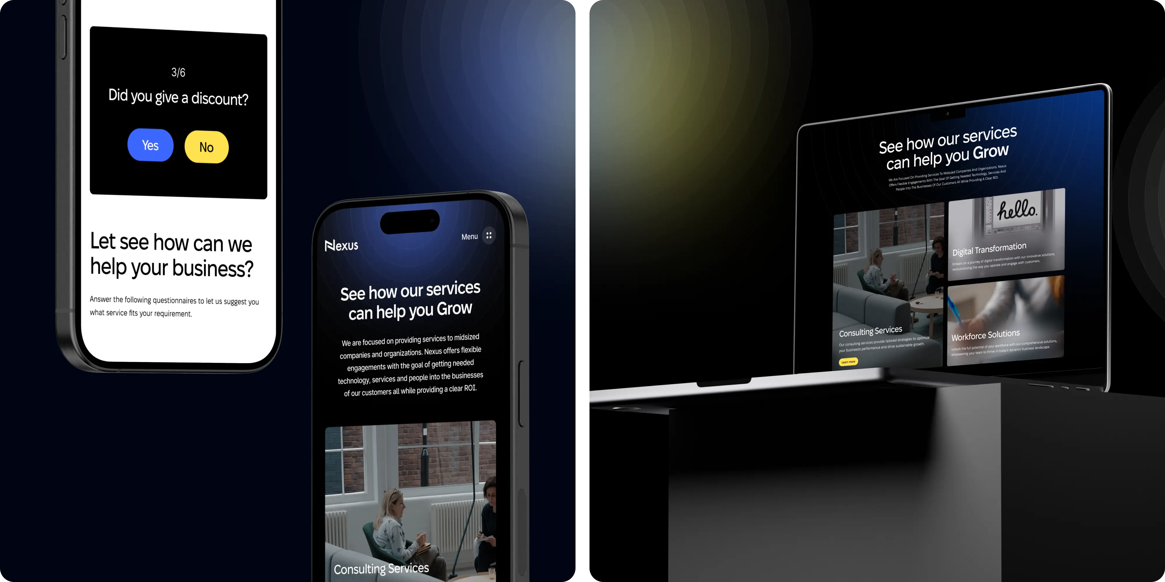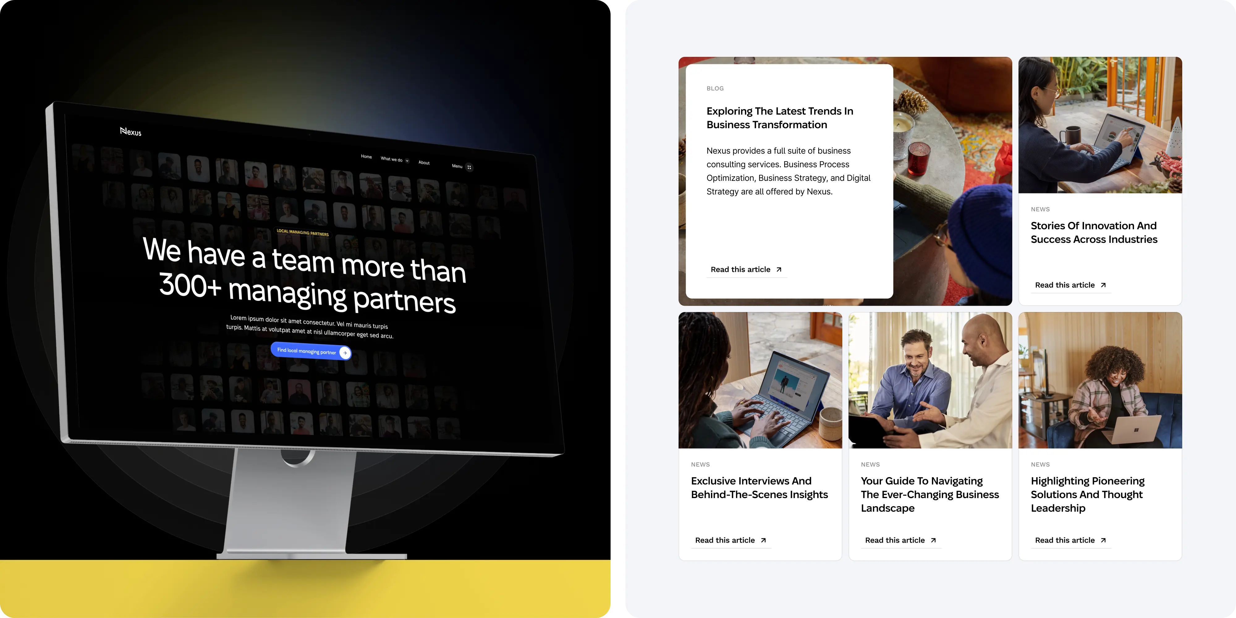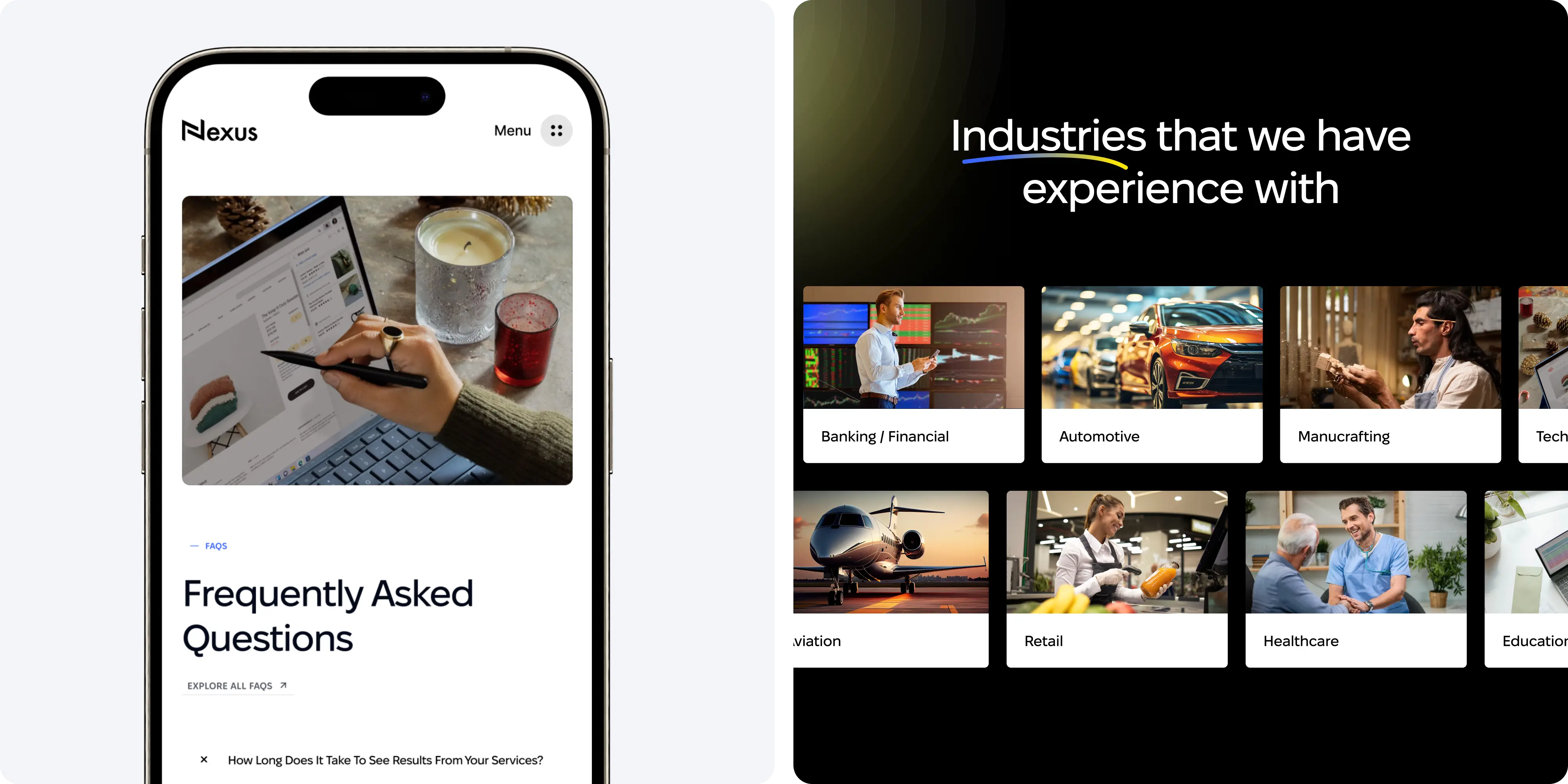 Brand Vision made several visual and aesthetic enhancements to Nexus's website. They selected a sleek, modern font to enhance readability and convey professionalism, and incorporated a vibrant yellow accent throughout the site to draw attention to key areas and calls to action. This pop of color created a dynamic and engaging visual experience, ensuring the website was both attractive and effective in guiding user interaction.